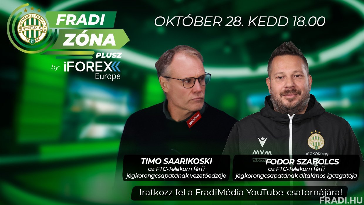 A Fradi Zóna Plusz by iFOREX Europe legújabb adását október 28-án, kedden 18.00-tól követhetik a FradiMédia hivatalos YouTube-csatornáján. Ezúttal férfi jégkorongcsapatunk vezetőedzőjével, Timo Saarikoskival, valamint a szakosztály általános igazgatójával, Fodor Szabolccsal beszélgetünk, fókuszban a Fradi eddig minden várakozást felülmúló szereplése az osztrák bázisú nemzetközi jégkorongligában, az ICEHL-ben.