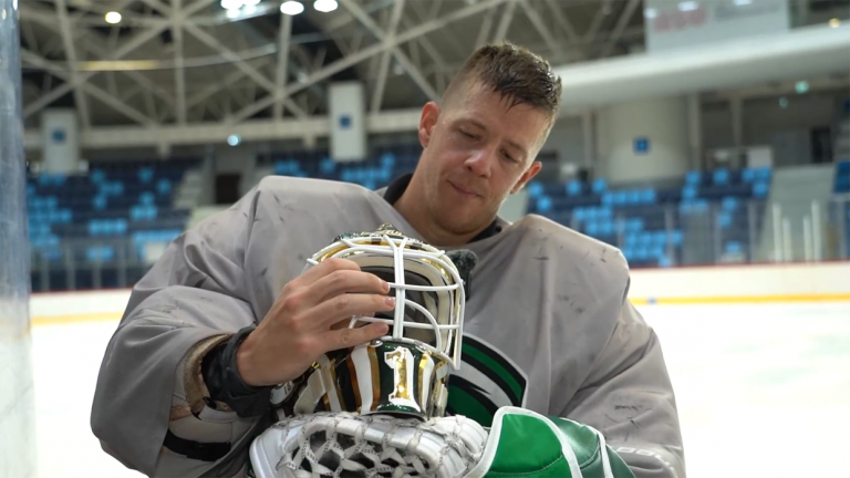 Először a FradiMédia kamerája előtt mutatta meg vadonatúj fejvédőjét Bálizs Bence, férfi jégkorongcsapatunk kapusa. Érdekesség, hogy az egyik norvég barátja tervezte és festette az egyedi mintázatú sisakot, amelyet az aranymotívumok mellett többek között egy hatalmas Fradi-sas is díszít.