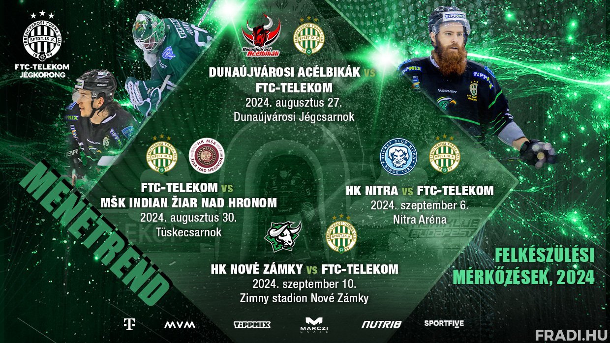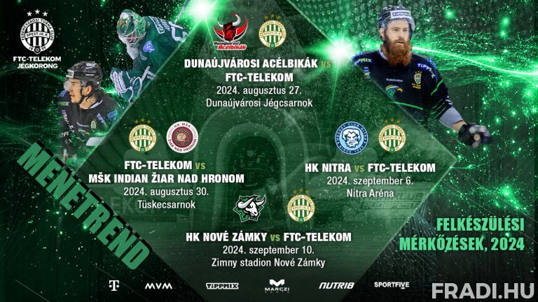 Mint arról folyamatosan beszámolunk, magyar bajnoki címvédő férfi jégkorongcsapatunk szakmai stábja a nyáron gőzerővel készül a következő szezonra. Ez viszont nem csak a játékoskeret kialakítására, hanem az előszezon felkészülési programjának szervezésére is igaz. Az FTC-Telekom a tervek szerint négy felkészülési mérkőzést játszik a klubszezont hagyományosan megnyitó Szuperkupa-döntő, valamint az Erste Liga 2024/25-ös idényének rajtja előtt, egyet hazai jégen, hármat idegenben. A felkészülési mérkőzések sorát augusztus 27-én Dunaújvárosban kezdjük, majd hazai pályán fogadjuk a szlovák Extraligás Zólyom farmcsapatát, a szlovák másodosztályú garamszentkereszti MŠK Indian Žiar nad Hronom együttesét. Szeptember elején kétszer utazunk idegenbe, először a szlovák Extraligában szereplő HK Nitra otthonába, akik az elmúlt évek alapján már hagyományos előszezonbeli ellenfelünknek számítanak, és akiknek jelenlegi erejéről sokat elmond, hogy az alapszakasz nyolcadik helyéről végül megnyerték a szlovák liga legutóbbi kiírását. Ezután következik a szintén szlovák Extraligás Érsekújvár.