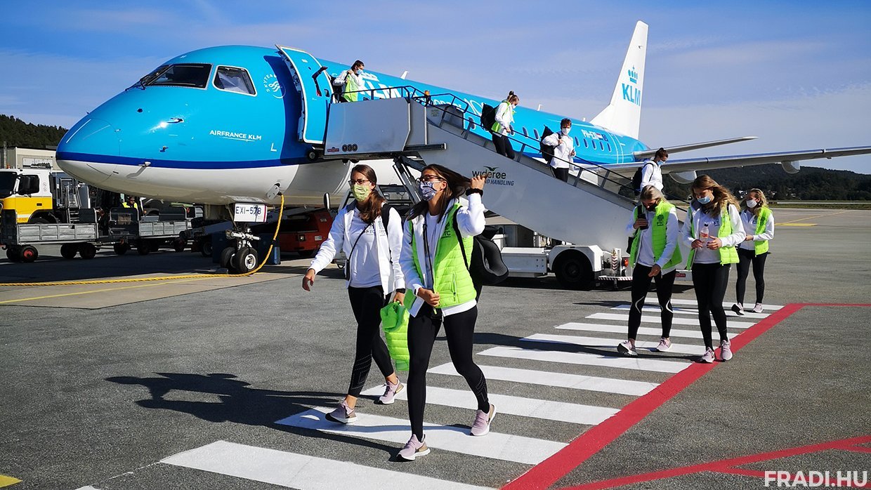 Csapatunk csütörtökön 4:45-kor indult, előbb Amsterdamba, majd onnan mintegy három órás várakozást követően Kristiansandba repült – mondhatjuk, hogy szerencsére különösebb esemény nélkül. A Norvégiába való megérkezést követően a küldöttség valamennyi tagját egyenesen a hotelbe szállították, s ott következett a beígért koronavírus-teszt. Ennek eredményéig, várhatóan pénteken délutánig a hotelből nem mozdulhat ki senki. Reményeink szerint pénteken este már lesz lehetőség edzést tartani, majd szombaton következhet a meccs – a csapat a norvégiai tartózkodása alatt egyébként a remélt negatív tesztek megérkezését követően sem mozdulhat ki a hotelből, illetve a vele egy épületben található sportcsarnokból.