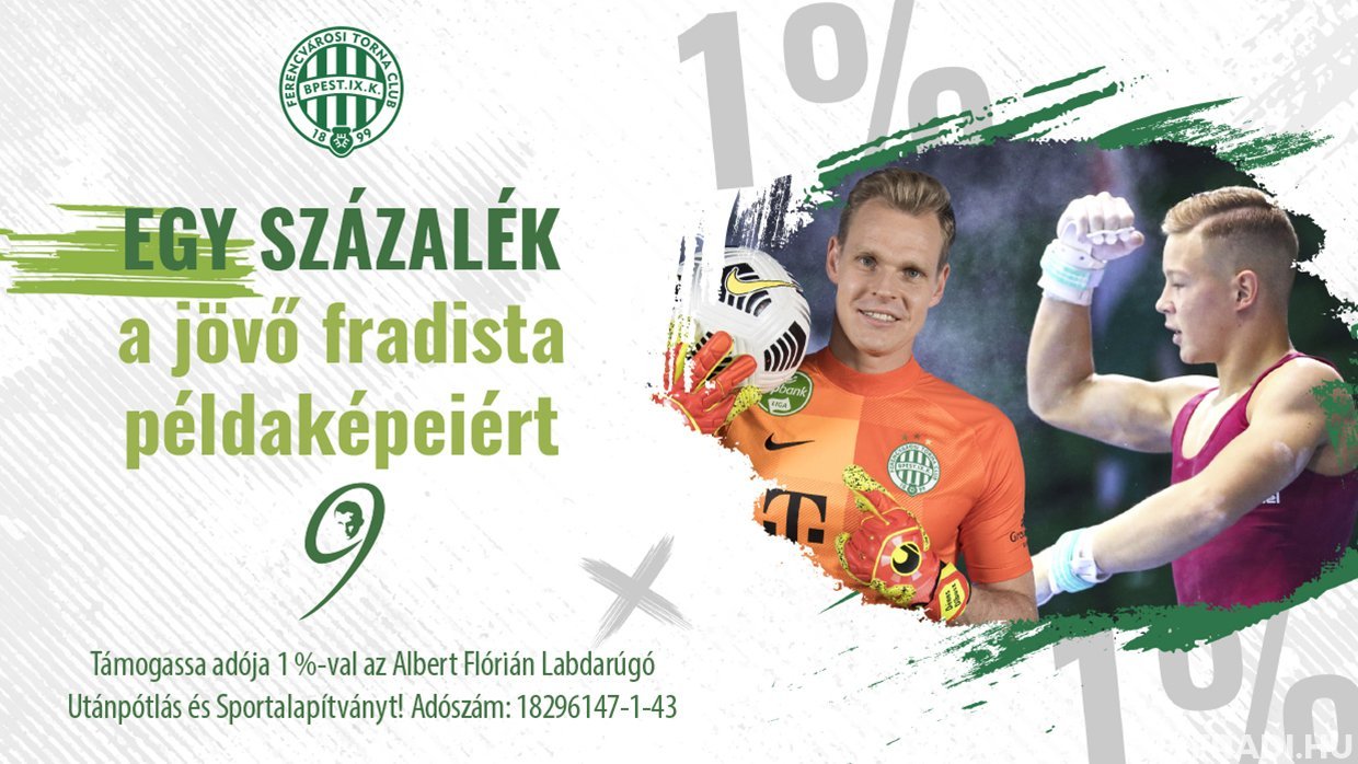 Egy százalék a jövő fradista példaképeiért - kérünk minden Fradi-szurkolót, hogy a jogszabály adta lehetőségekkel élve adója 1 százalékával támogassa a Ferencvárosi Torna Club központi alapítványát, az Albert Flórián Labdarúgó Utánpótlás és Sportalapítványt!