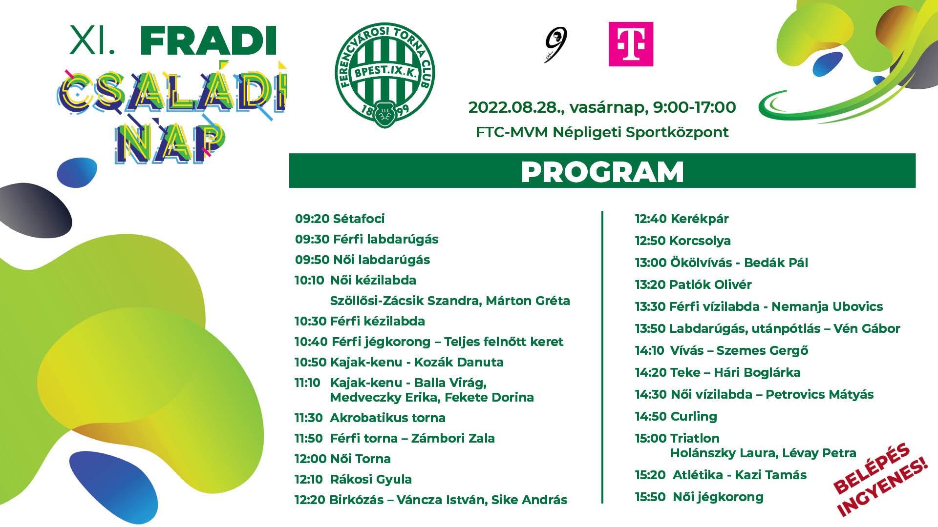 Az idei családi napon is rengeteg program és több sztársportolónk várja önöket. Bemutatkoznak a Ferencvárosi Torna Club szakosztályai, de volt és jelenlegi sportolók részvételével lesz autogramosztás, illetve színpadi interjúkat is hallhatnak kedvenceikkel. Várhatóan 9.30-tól férfi labdarúgóink közül érkeznek a pódiumra, őket követik a női futballisták, a női és férfi kézilabdázók, majd a zsinórban négyszeres bajnok jégkorongcsapatunk teljes felnőtt kerete.