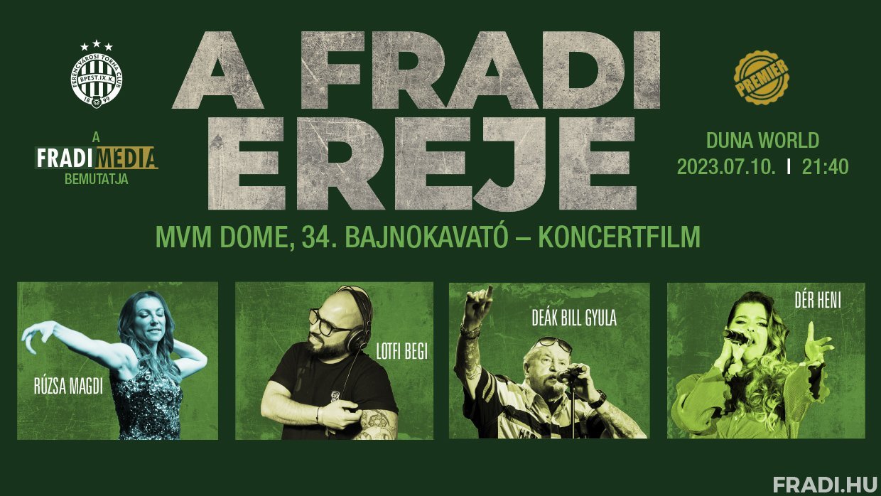 A FradiMédia az ITT visszanézhető 48 – Álomból valóság című kisfilm után újabb alkotással jelentkezik: elkészült a májusi, MVM Dome-ban rendezett bajnokavatónkon felvett koncertfilm, amely „A Fradi ereje” címet kapta! Ezt július 10-én, hétfőn 21.40-től a Duna World országos televíziós premierként mutatja be.