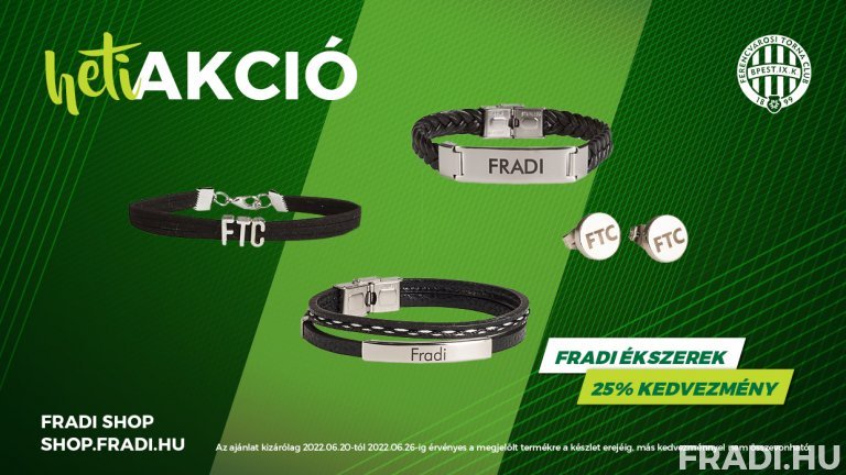 Heti akciót indítottunk a Groupama Aréna földszintjén található Fradi Shopban, az FTC-MVM Népligeti Sportközpontnál lévő Fradi Boltban és a shop.fradi.hu-n! Hétről hétre más árucsoport termékeit kínáljuk kedvezményes áron – legutóbb a Fradi Vitamin+C nevű termékünkre hirdettünk akciót, ezúttal ékszereinket kínáljuk kedvezményes áron.