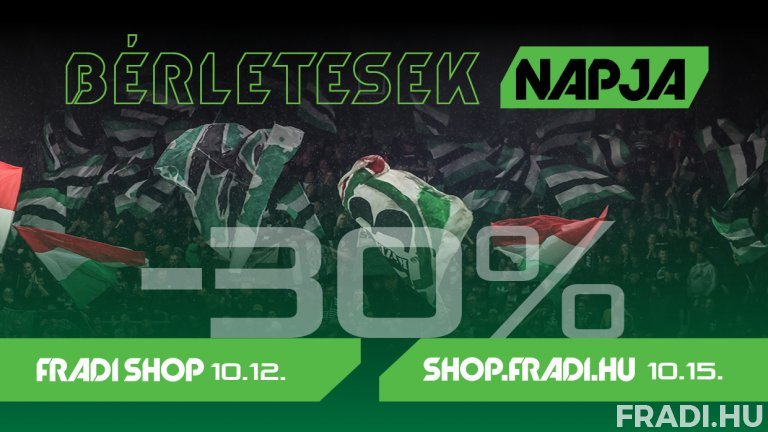 Mindemelett október 15-én, kedden kizárólag online, a shop.fradi.hu oldalon is 30% kedvezménnyel vásárolhatnak labdarúgóbérletes szurkolóink, ráadásul 30 ezer Ft feletti belföldi rendelésnél a szállítás ingyenes!