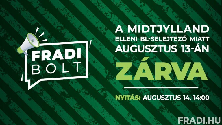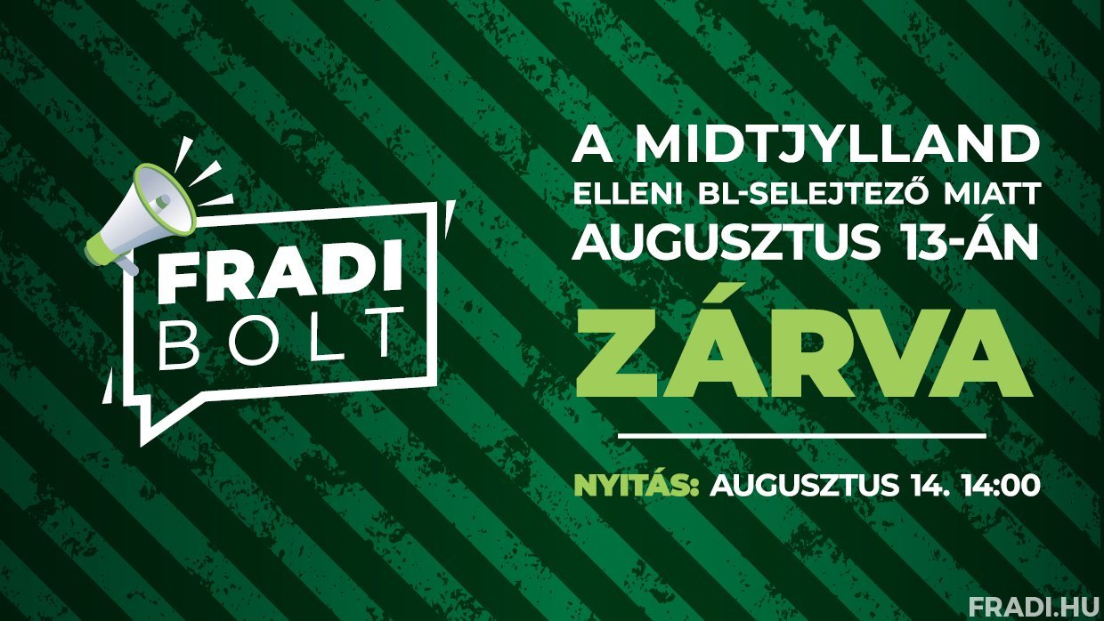 Változik az FTC-MVM Népligeti Sportközpontban található Fradi Bolt nyitvatartása. Üzletünk augusztus 13-án, kedden a Midjtylland elleni BL-selejtező napján zárva tart! Másnaptól, azaz augusztus 14-e, szerdától a megszokott nyitvatartási renddel (hétfőtől péntekig 14.00 és 19.00 között) újra nyitva lesz.