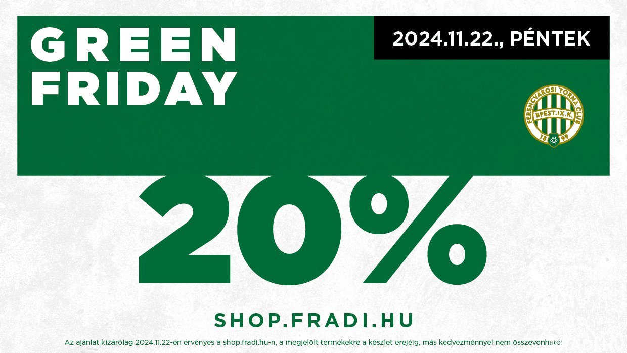 November 22-én, pénteken Green Fridayt (Zöld pénteket) tartunk online webáruházunkban, a shop.fradi.hu oldalon. Kihagyhatatlan akciót ajánlunk szurkolóink figyelmébe, hiszen 20 százalékos kedvezménnyel vásárolhatnak a megjelölt termékekből.
