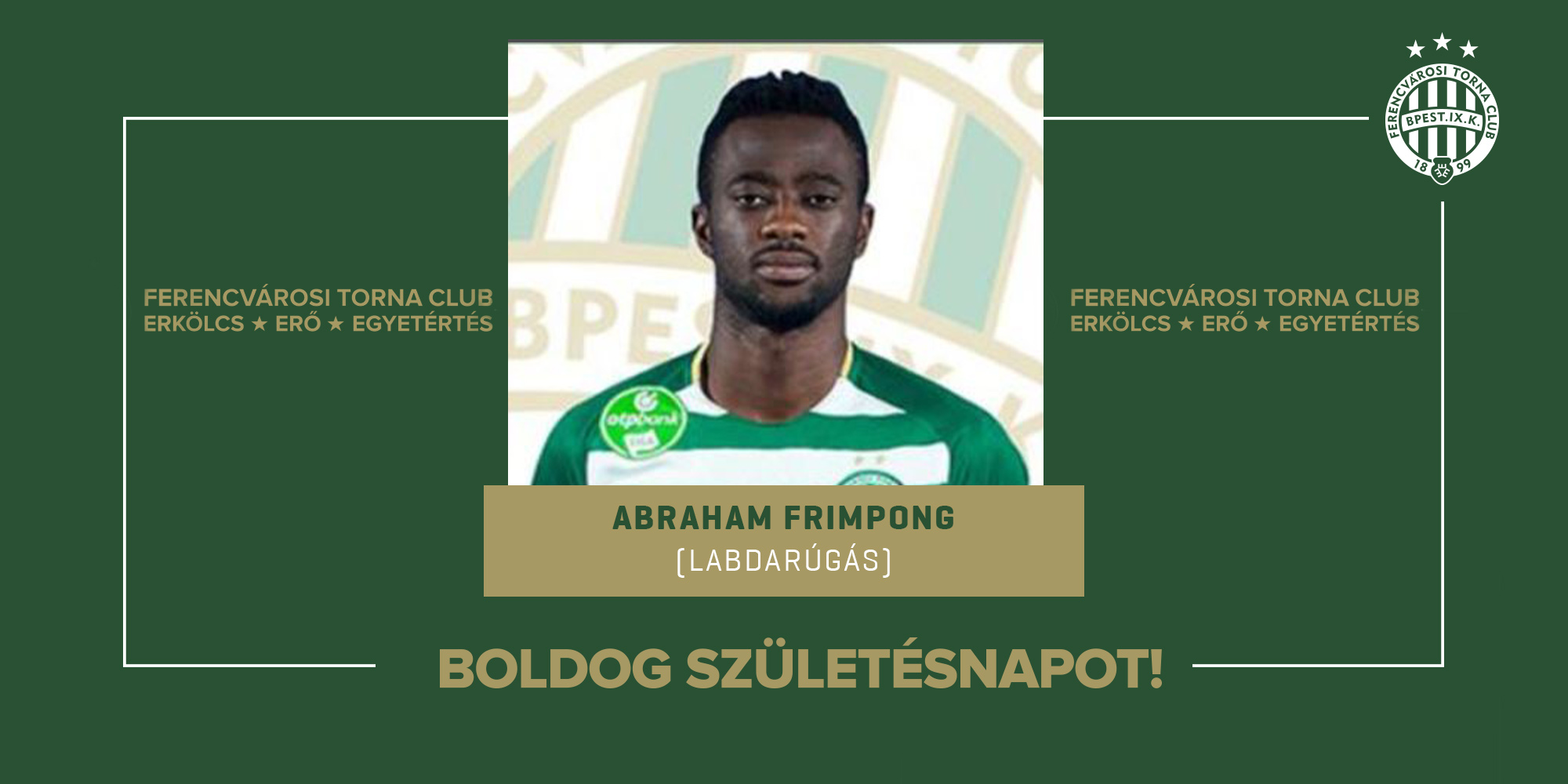 Ma ünnepli születésnapját férfi labdarúgócsapatunk korábbi játékosa, a háromszoros magyar bajnok Abraham Frimpong, aki tagja volt a 2019-ben az Európa Liga, 2020-ban a Bajnokok Ligája csoportkörébe jutott együttesünknek.