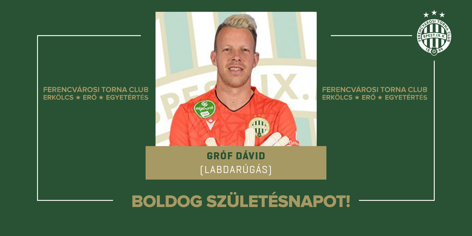 Ma ünnepli születésnapját férfi labdarúgócsapatunk kapusa, a kétszeres magyar bajnok Gróf Dávid, az EL-ben 2019-20-ban csoportkörös, 2025-26-ban nyolcaddöntős együttesünk tagja.
