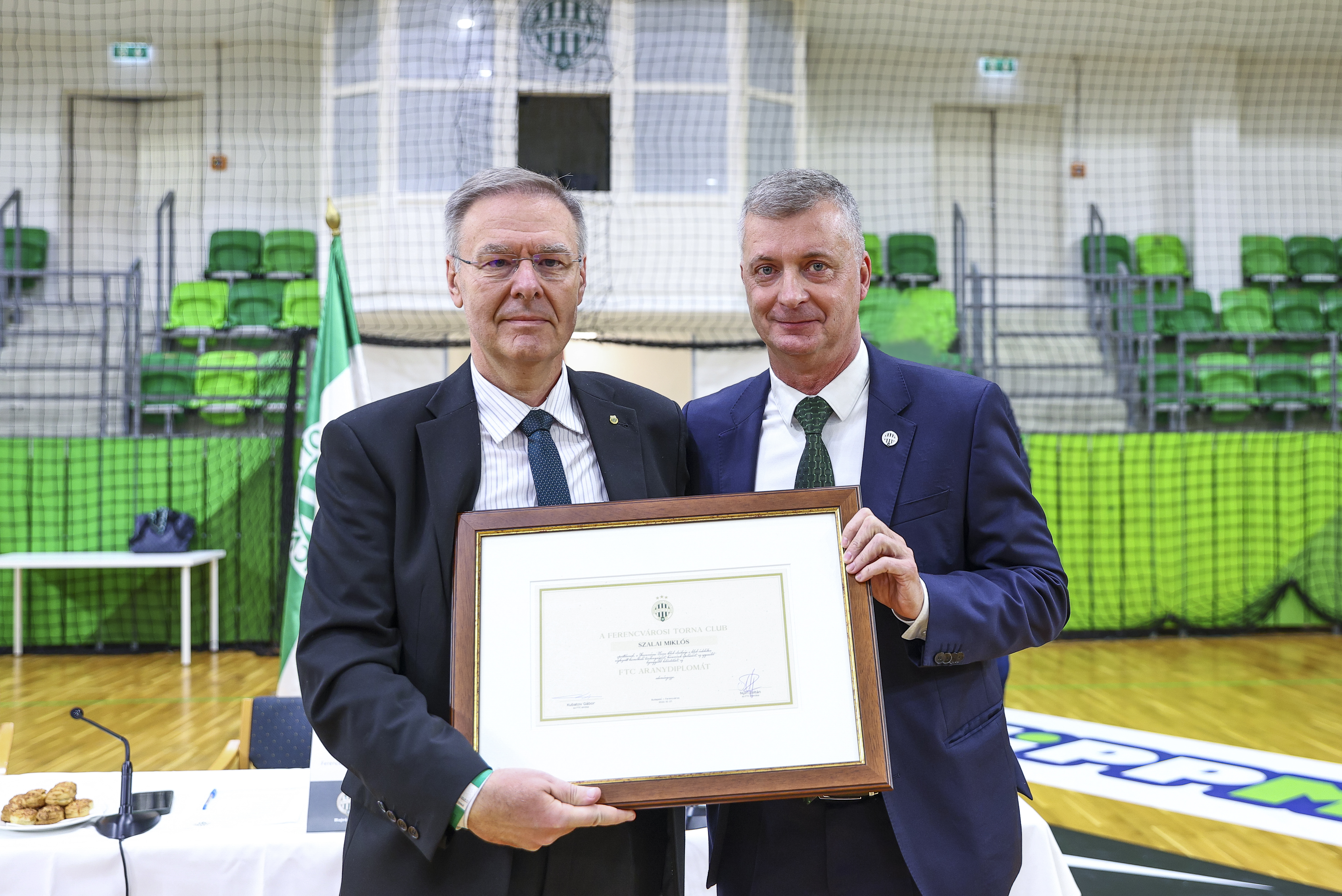 Az FTC elnöke külön köszöntötte a nyugdíjba vonuló gazdasági igazgatót, Szalai Miklóst, aki a klub legrangosabb kitüntetését, az Aranydiplomát vehette át Kubatov Gábortól.