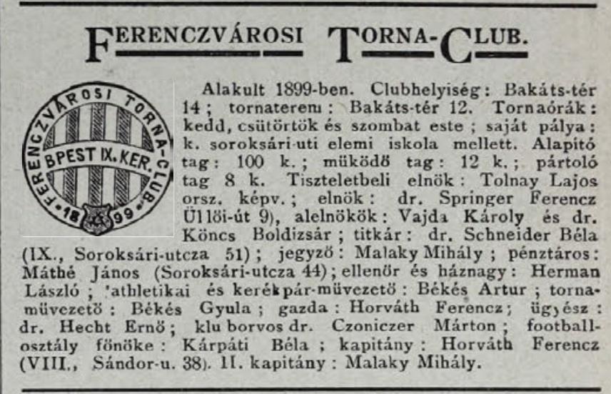 Az FTC-ben a sportolók - 1900-ban elsősorban a labdarúgók - több sportággal foglalkoztak, úsztak, atletizáltak, tornáztak, kerékpároztak. A vezetőség felismerte, hogy a sportágak szétválása segíti az egyesület további fejlődését, ezért úgy döntött, hogy önálló szakosztályokat hoz létre, elsőként – mondhatni, természetesen - megalakítja a futball-szakosztályt. Erre 1900. december 3-án került sor. A labdarúgók vezetője Kárpáti Béla lett, a kapitánya Horváth Ferenc.