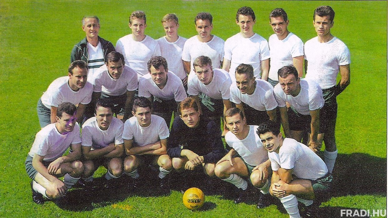 Állnak balról: Lakat Károly dr. edző, Géczi István, Novák Dezső, Havasi Sándor, Perecsi Tibor, Mátrai Sándor, Páncsics Miklós, Juhász István, Szűcs Lajos, Horváth László, Takács Béla. Guggolnak balról: Szőke István, Karába János, Varga Zoltán, Albert Flórián, Rákosi Gyula, Rátkai László, Katona Sándor, Fenyvesi Máté.