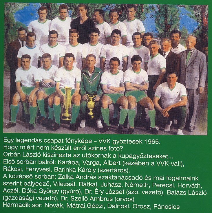 Az 1964-es bajnokcsapat. Hátul állnak balról: Mészáros József edző, Havasi Sándor, Varga Zoltán, Dalnoki Jenő, Albert Flórián, Mátrai Sándor, Páncsics Miklós. Középen balról: Friedmanszky Zoltán, Rátkai László, Novák Dezső, Juhász István, Vilezsál Oszkár, Galambos Antal. Elöl balról: Fenyvesi II József, Rákosi Gyula, Perecsi Tibor, Géczi István, Orosz Pál, Fenyvesi Máté.