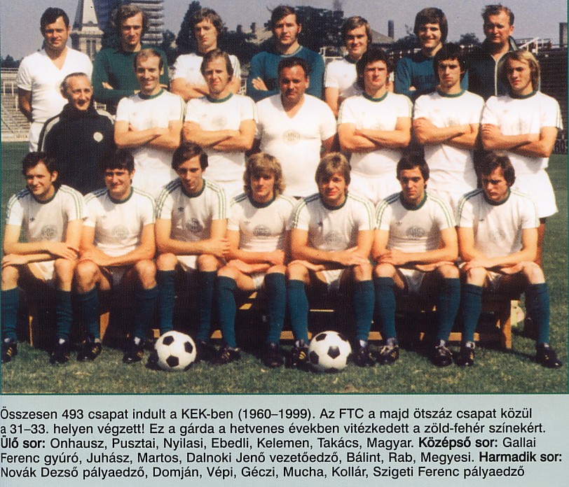 Volt már az FTC történelmében KK, VVK, UEFA Kupa menetelés, amelyekről a megfelelő időben részletesen írtunk. A KEK azonban eddig a szezonig kimaradt a sorból. A KEK, azaz Kupagyőztesek Európa Kupája, amely abban az időben a második számú európai kupasorozat volt, az európai országok kupagyőztesei indultak benne. Az 1973/74-es MNK győzelemmel a Fradi ebbe a sorozatba váltott belépőjegyet. Az első ellenfél a wales-i Cardiff City volt, amely ellen az Üllői úton 2:0-ra, Cardiff-ban 4:1-re nyert a csapat, mintegy ráhangolódott a sorozatra. A következő ellenfél ugyancsak a szigetországba szólította a Fradit, azonban jóval veretesebb volt, a Liverpool. A sorsolás pillanatában sokan előre temették a csapatot, ők azonban mindenkire alaposan rácáfoltak. Liverpoolban hősiesen helytálltak, Máté János a 92. percben kiegyenlítette az angolok előnyét, 1:1-re alakította az eredményt. A hazai visszavágón 30 000 ember szorongott az Üllői úton és láthatták, hogy az angol sztárcsapat nem tud mit kezdeni a ferencvárosi védelemmel, akik Bálint László vezérletével minden rohamot visszavertek, így 0:0-ra hozták a mérkőzést. Ekkor már az idegenben lőtt gólok szabálya élt a kupasorozatokban, így azzal jutott tovább az FTC. 1975 tavaszán, már a negyeddöntőben a svéd Malmö következett. Az első, Svédországban rendezett találkozót nagy meglepetésre 3:1 arányban megnyerte a Fradi, így a visszavágó 1:1-es döntetlenje már elődöntőt ért. Elődöntőt, ahol a jugoszláv élcsapat, a Crvena Zvezda várt a csapatra. Mondani sem kell, az új stadion 30 ezres befogadóképessége kicsinek bizonyult, így a mérkőzést a „régi albérletbe”, a Népstadionba vitték, ott sokkal többen láthatták, hogy nagy csatában a Fradi 2:1-re legyőzte a jugókat. A visszavágó azonban pokolinak ígérkezett, egyrészt ott még több, 110 ezer fanatikus szerb rajongó őrjöngött a stadionban, másrészt az ellenfél játékosai is „vért ittak”. A Ferencváros az alábbi összeállításban kezdett: Géczi – Martos (Kelemen 92.perc), Bálint, Rab, Megyesi – Juhász, Onhausz (Takács 53.perctől), Mucha – Pusztai, Máté, Magyar. Pusztai László már a 7. percben döbbenetet okozott a stadionban, amikor megszerezte a vezetést, amit a jugók az 50. percben tudtak kiegyenlíteni. A Fradi védelme azonban Bálint László vezérletével jól állta a sarat, annak ellenére, hogy az ellenfél játékosai gyakran a brutalitás határát súrolták mindenáron való győzniakarásukban. Ezt a túlzott keménységet a játékvezető megtorlatlanul hagyta, ezek után nagy meglepetésre Bálintot a 70. percben egy „sima” szabálytalanságért azonnal, sárga lap nélkül kiállította. A vezérét vesztett védelem öt perc múlva kapitulált, a Zvezda megszerezte a vezetést. Volt még hátra 15 perc, a Fradi 10 emberrel játszott, a stadionban senki egy lyukas garast nem adott volna a továbbjutásukért. Támadgatott, tartotta a labdát az ellenfél, amikor a 80. percben a Fradi egy gyors ellentámadást vezetett, Mátét a 16-oson belül úgy szerelték szabálytalanul, hogy azt még a bíró is annak látta, megítélte a büntetőt. Az első számú 11-es lövő ebben a korban Bálint László volt, aki nem volt a pályán, ezért Megyesi István állt a labda mögé és hihetetlen nyugalommal úgy gurította a sarokba a labdát, hogy előtte a kapus a másik irányba vetődött, mondták is a régiek, ez amolyan „Novák-módi” volt. A hátralevő 10 percet kibírta a Fradi, így hősies küzdelemben megtették azt, amire korábban senki sem gondolt, bejutottak a KEK-döntőbe, amit 1975. május 14-én Basel-ben rendeztek. Nem elég, hogy Bálint nem játszhatott, az MLSZ sem volt a Fradival. Kérték ugyanis, hogy a május 10-én, Békéscsabán vívandó bajnoki meccset halasszák el, amit nem engedélyeztek. Végül a parázs hangulatú, nagyon kemény mérkőzésen többen is megsérültek, Pusztai úgy, hogy nem is tudott játszani a kupadöntőn, azon a döntőn, ahol a szovjet sztárcsapat, a Dinamo Kijev végül 3:0-ra legyőzte a Ferencvárost.