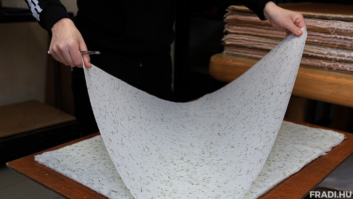 — ezután szétválasztották a vásznakat a papírívektől, egy toronyba rakták és átvitték a szárítóüzembe, ahol kiterítették a lapokat egy lazább szövésű dróthálóra, itt egy teljes napon keresztül, 30-35 fokos melegben levegőzött, száradtak az ívek