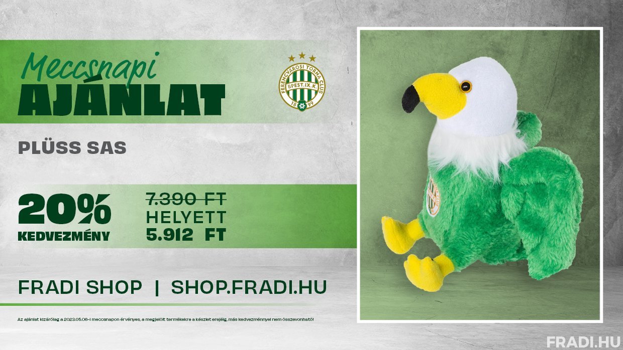 Férfi labdarúgócsapatunk május 6-án, szombaton a Kisvárdát látja vendégül a Groupama Arénában. A mérkőzésre a Fradi Shop ismét remek ajánlattal készül: szurkolóink a plüss sast az eredeti, 7.390 forintos árhoz képest 20%-kal olcsóbban, 5.912 forintért vásárolhatják meg.