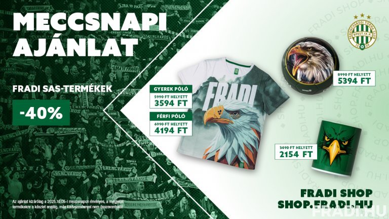 A Férfi Fehér Fradi Sas póló 6990 forint helyett most csak 4194 forint lesz, a Gyerek fehér Fradi Sas pólót 5990 forint helyett most 3594 forintért vásárolhatják meg. Emellett akciósan szerezhetik be a Fradi Sas labdát és a Zöld bögrét is, előbbi 5394, míg utóbbi 2154 forintba fog kerülni.
