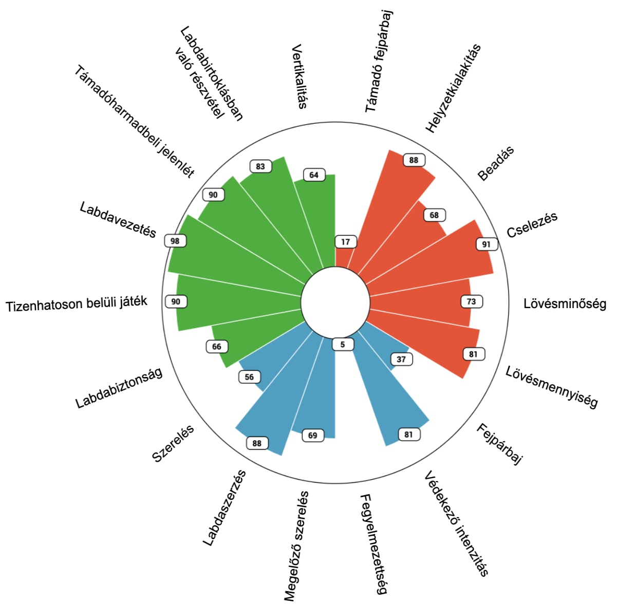 Ezekre a típusú középpályásokra általánosságban az a jellemző, hogy nagy területet játszanak be, ezáltal mindig ott vannak a labda közvetlen közelében és így sok párharcot vívnak. Az alábbi ábrán Ben Romdhane 2023/2024-es bajnoki teljesítményét látjuk a többi NB I-ben játszó box-to-box középpályáshoz viszonyítva. A 1-től 100-ig terjedő értékek azt jelentik, hogy a posztriválisainak hány százalékát előzi meg az adott mutatóban. A zöld a passzjátékkal, a piros a támadással, a kék a védekezéssel kapcsolatos mutatókat fedi le. Jól látszik, hogy Ben Romdhane a játék összes fázisában kiemelkedő teljesítményt nyújt, és nagyon kevés olyan mutató van, amelyben 50 százalék alatt áll, vagyis az átlagosnál rosszabb lenne.