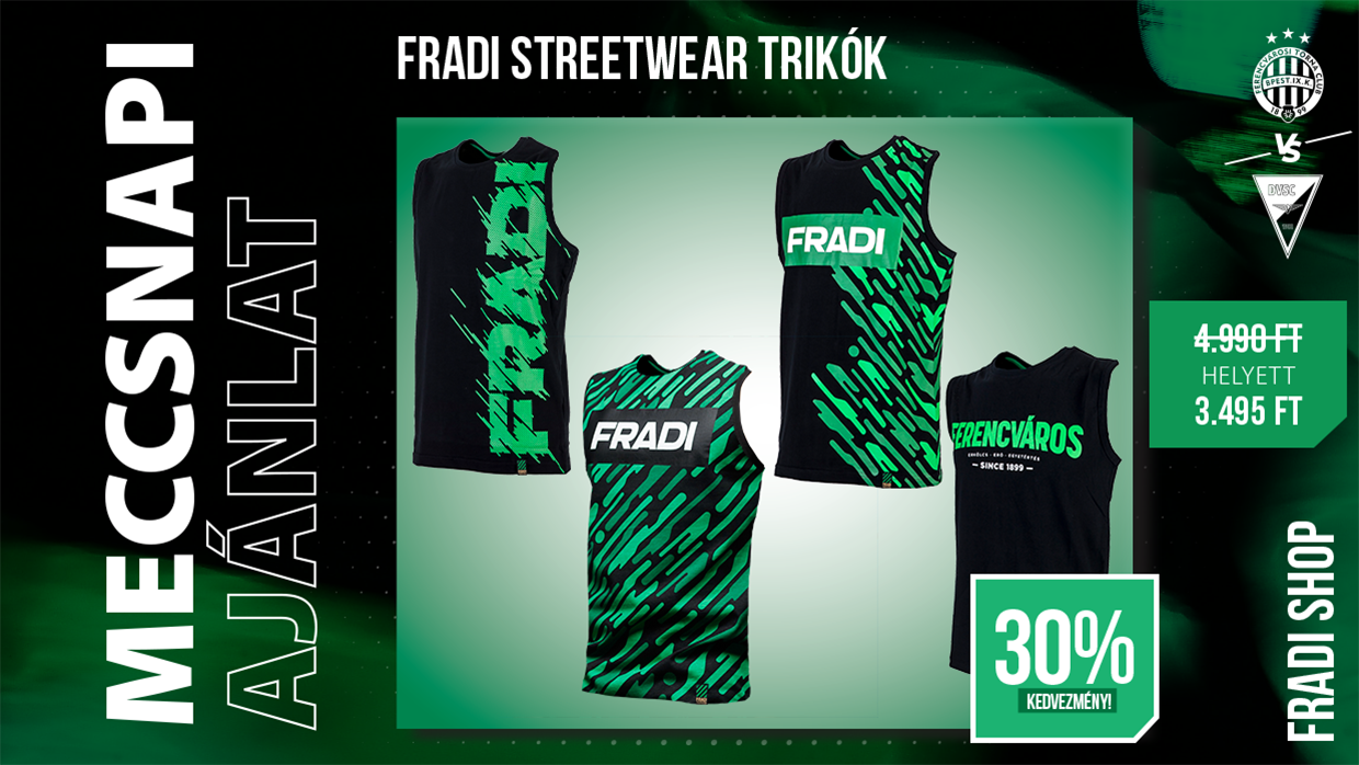 Mind a négy felső tökéletes választás szurkolóink fradizmusának kifejezésére. Ráadásul a DVSC elleni mérkőzés napján óriási akcióval szerezhetők be a fent említett pólók. A 4.990 forintos eredeti ár helyett, a meccs napján 30% kedvezménnyel, 3.495 forintért vásárolhatók meg a Groupama Arénában található Fradi Shopban, illetve a webshopunkban, a shop-fradi.hu-n!