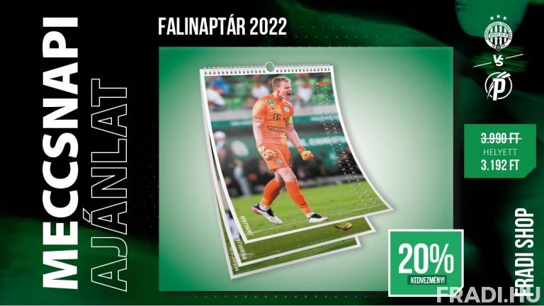 Ahogy azt szurkolóink már megszokhatták, ezúttal is meccsnapi ajánlattal készülünk: a rangadón a játékosaink fotóival ellátott, A3-as méretű 2022-es falinaptárunkra biztosítunk 20 százalék kedvezményt, amely elérhető lesz a Groupama Arénában található Fradi Shopban, az MVM Gold szektorban, a Fradi-minibusznál és természetesen a shop.fradi.hu oldalon. A termék eredeti ára 3.990 forint, de a kedvezménynek köszönhetően a naptárt a meccsnapon 3.192 forintért vásárolhatják meg szurkolóink.