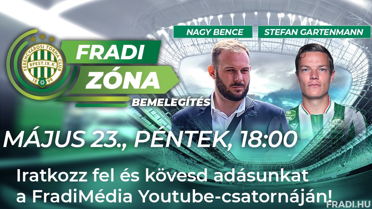 Május 23-án, pénteken 18.00-kor kezdődik a Fradi Zóna Bemelegítés vadonatúj epizódja, amelyben a műsorvezető svájci válogatott védőnkkel, Stefan Gartenmann-nal és labdarúgócsapatunk tolmácsával, Nagy Bencével beszélget a bajnoki címről döntő, szombati ETO FC Győr elleni idegenbeli találkozónkról.