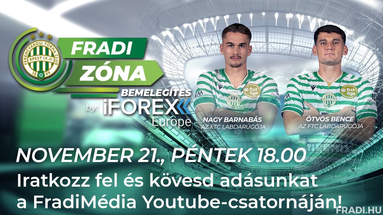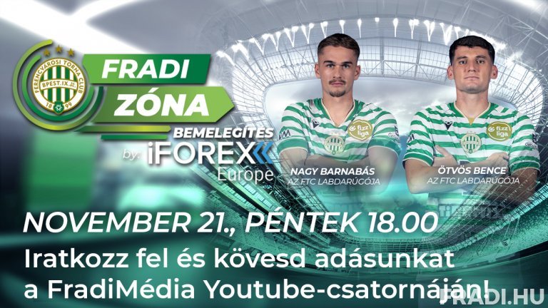 November 21-én, pénteken 18.00-kor kezdődik a Fradi Zóna Bemelegítés by iFOREX Europe vadonatúj epizódja, amelyben a Nyíregyháza elleni szombati bajnoki felvezetéseként műsorvezetőnk klubunk két játékosával, a nyíregyházi születésű és nevelésű Ötvös Bencével, valamint a nyáron éppen soron következő ellenfelünktől a Ferencvárosba igazolt Nagy Barnabással beszélget.