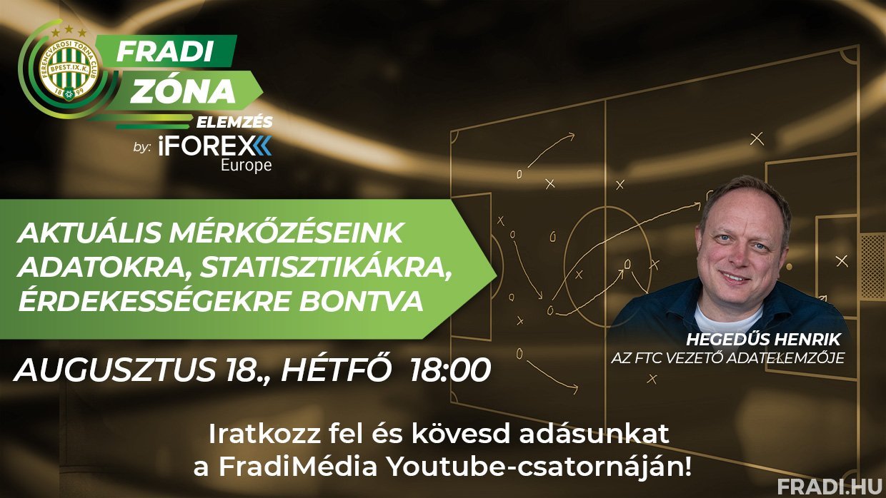 A nagysikerű meccsnapi értékelő műsor után április 7-én vadonatúj, exkluzív műsorral bővült vodcastunk: a Fradi Zóna Elemzés by iFOREX Europe adásában az aktuális mérkőzésünket követő hétfőn Jáky Gergely műsorvezető az FTC vezető adatelemzőjével, Hegedűs Henrikkel beszélgetett, aki a legutóbbi találkozóból készített friss statisztikákkal, kimutatásokkal, érdekességekkel készült.
