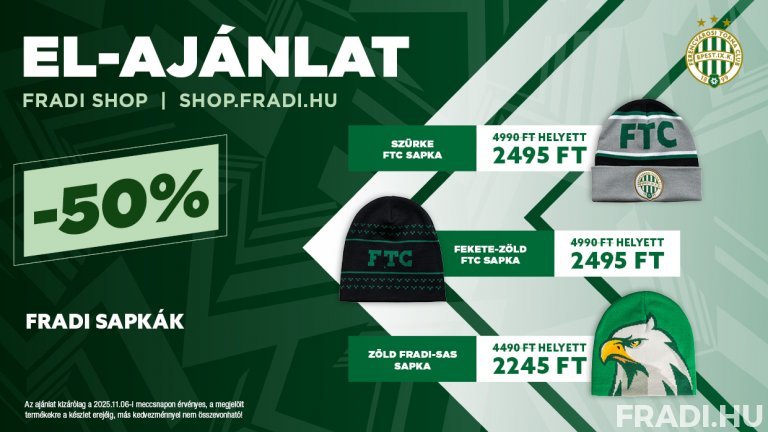 A szürke és a fekete-zöld sapka most 4990 Ft helyett mindössze 2495 Ft-ba kerül, míg a Zöld Fradi-sas sapkát 4490 Ft helyett csupán 2245 Ft-ért vehetik meg drukkereink.