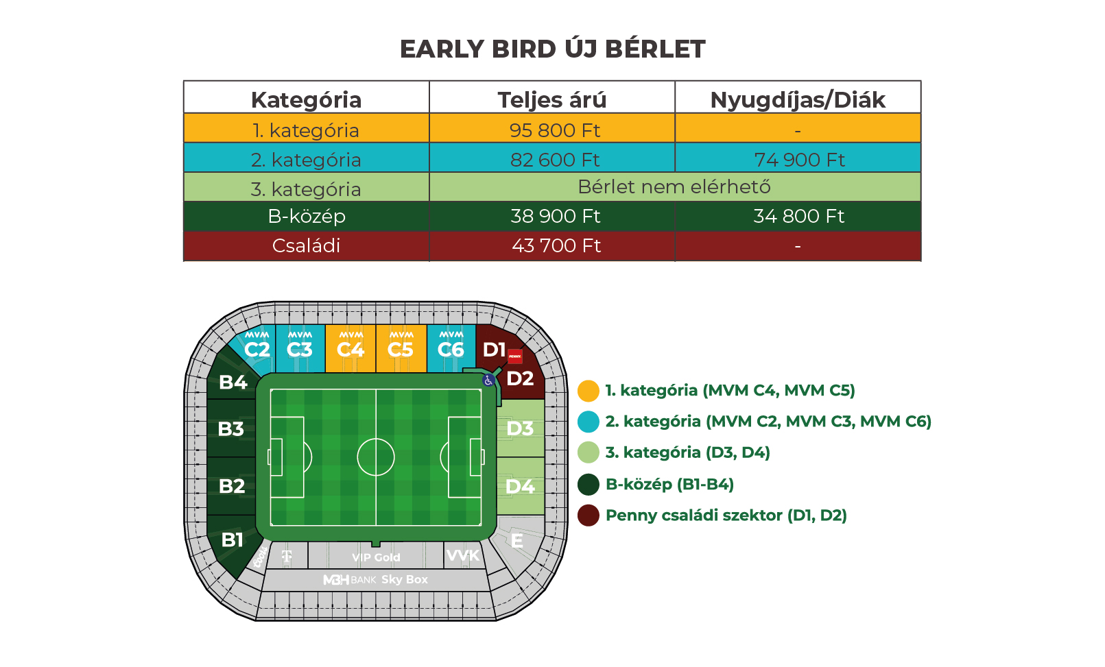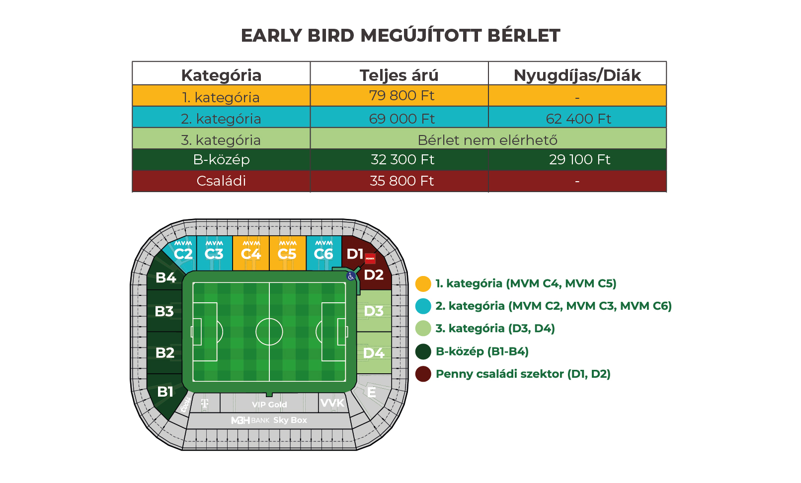 Az értékesítés első, early bird szakaszában április 17., 10:00-től az utolsó bajnoki mérkőzésnap végéig, azaz május 17., 24:00-ig a normál bérletárakhoz képest szurkolóink 20 százalékos kedvezménnyel juthatnak hozzá bérletükhöz.