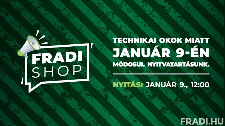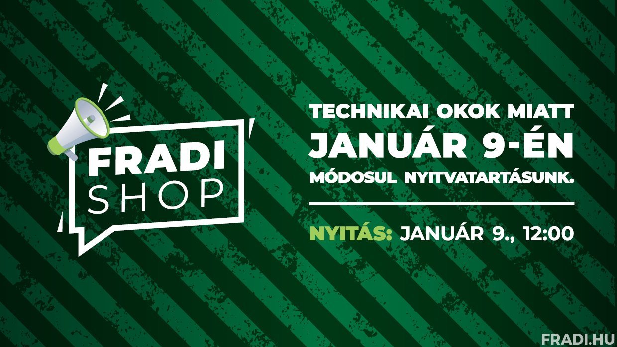 Felhívjuk szurkolóink figyelmét, hogy a Groupama Arénánál található Fradi Shop technikai okok miatt január 9-én, pénteken csak 12 órakor nyit majd ki. Üzletünk a megszokott módon, 19 óráig várja vásárlóit.