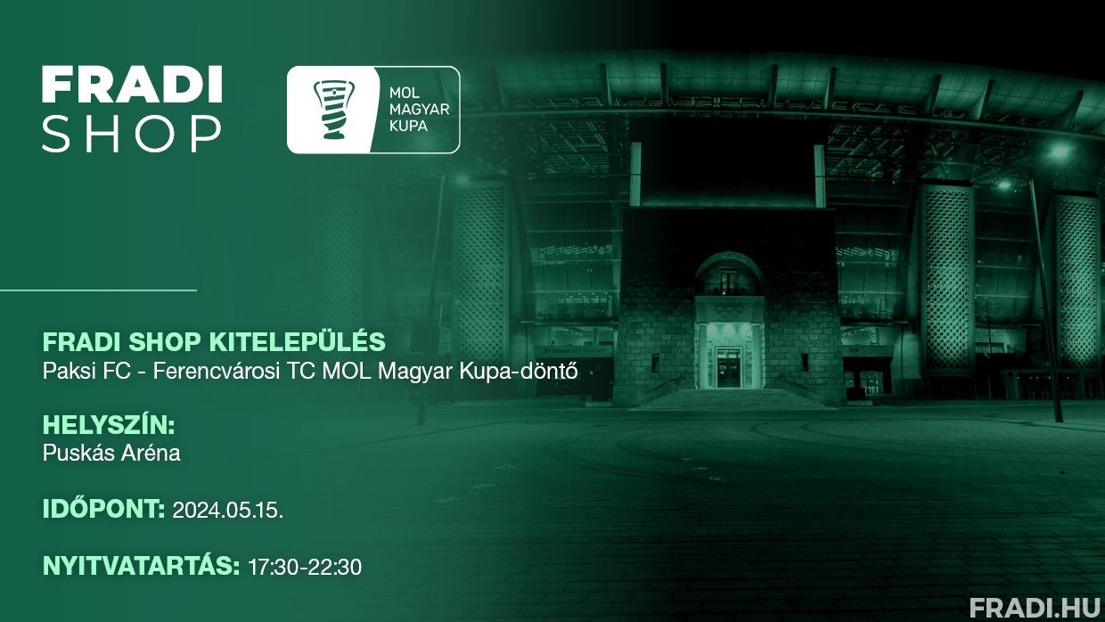 A MOL Magyar Kupa-döntő miatt a Groupama Arénánál található Fradi Shop üzletünk nyitvatartása az alábbiak szerint változik: