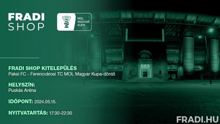 Férfi labdarúgócsapatunk május 15-én, szerdán, 19:30-kor a MOL Magyar Kupa döntőjében lép pályára a Paks ellen. A találkozónak a Puskás Aréna ad otthont. A finálé apropóján a Fradi Shop a létesítmény több pontjára is kitelepül. A sálas standok a 137-101-es, illetve a 133-134-es szektor oszlopai között lesznek megtalálhatók. Itt Bajnokcsapat 35. és FTC 125 sálat, valamint egyéb kötött sálakat vásárolhatnak szurkolóink. A meccs napján, 17:30-tól 22:30-ig tartanak nyitva ezek a standok. A Fradi Kamion az F kapu előtt parkol majd, míg a Fradi-minibuszt a kamionnal átellenben, az A kapunál találják majd drukkereink.