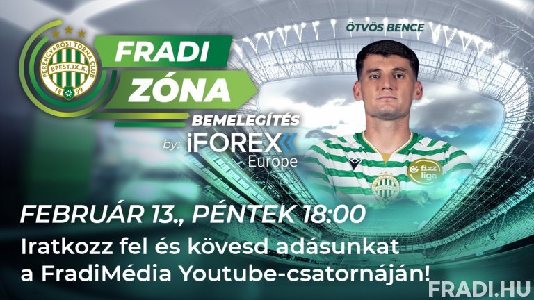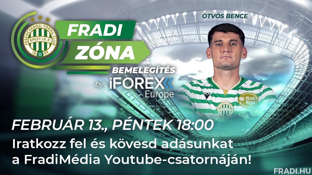 Február 13-án, pénteken 18 órakor kezdődik a Fradi Zóna Bemelegítés by iFOREX Europe vadonatúj epizódja, amelyben aktualitásokról, a szerdai Aqvital FC Csákvár elleni MOL Magyar Kupa továbbjutásról, az Újpest elleni derbiről és a szombaton sorra kerülő, ZTE FC elleni bajnoki mérkőzésről beszélget a műsorvezető klubunk játékosával, Ötvös Bencével.