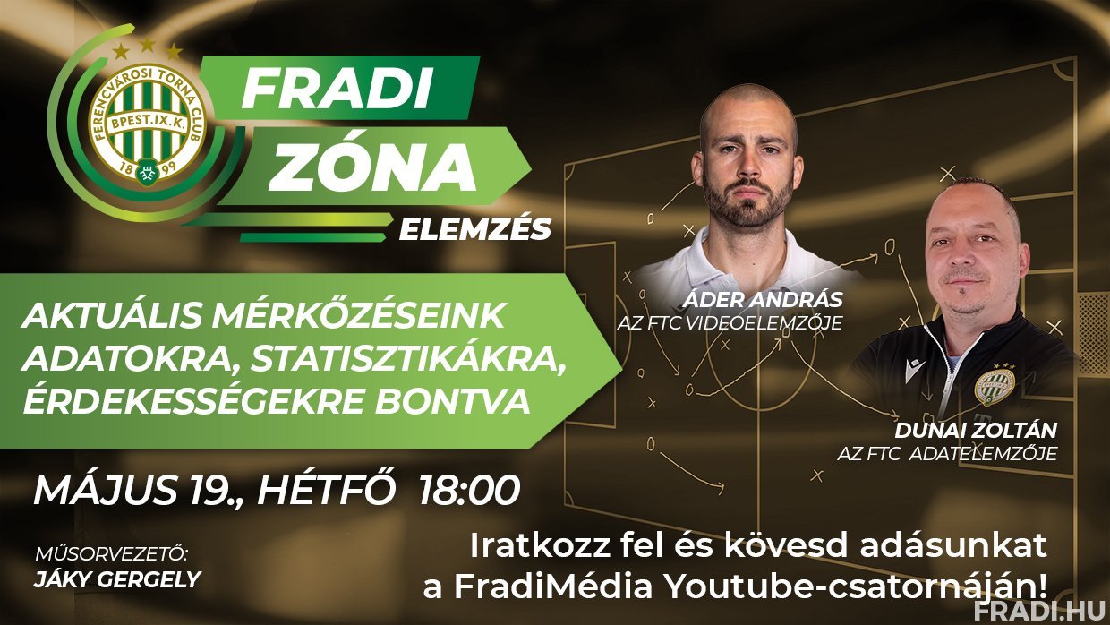 A Fehérvár elleni, utolsó hazai bajnoki után május 19-én, hétfőn, 18.00-tól kerül sor a mérkőzés kielemzésére a Fradi Zóna Elemzés következő adásában, amelyben ezúttal új vendégek várják a nézőket. Férfi labdarúgócsapatunk videóelemzője, Áder András mellett klubunk adatelemzője, Dunai Zoltán is beszél a mérkőzés statisztikáiról, a pontrúgások fontosságáról, a játék egyes aspektusairól, valamint játékosaink teljesítményéről. Az értékelő műsorhoz hasonlóan ezt az adást is az FTC hivatalos YouTube-csatornáján tudja megtekinteni. A Fradi Zóna Elemzés eddigi részeit IDE kattintva nézheti meg.