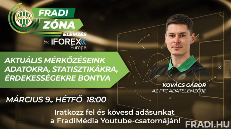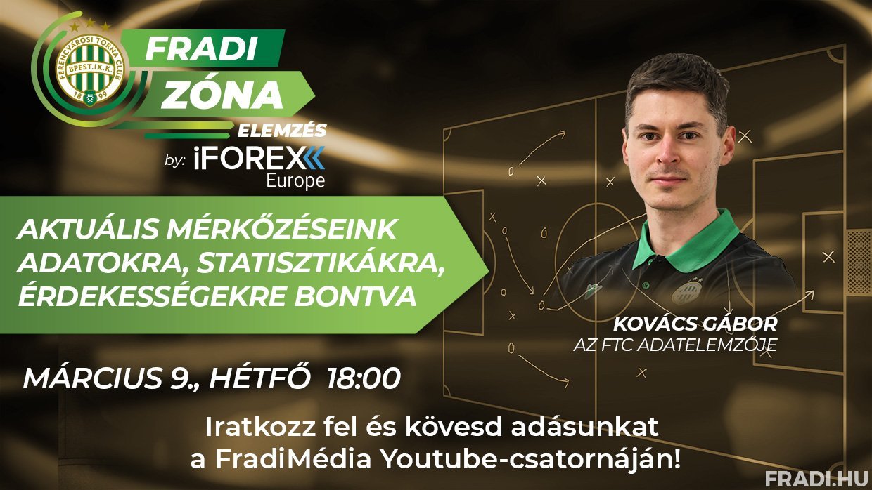 A nagysikerű meccsnapi értékelő műsor után, ahogy azt már az elmúlt hónapokban rendszeres nézőink megszokhatták, hétfőnként újabb exkluzív vodcast következik: a Fradi Zóna Elemzés by iFOREX Europe adásában az aktuális bajnokinkat követő hétfőn Jáky Gergely műsorvezető az FTC adatelemzőjével, Kovács Gáborral beszélget, aki a legutóbbi mérkőzésből készített friss statisztikákkal, kimutatásokkal, érdekességekkel készül.