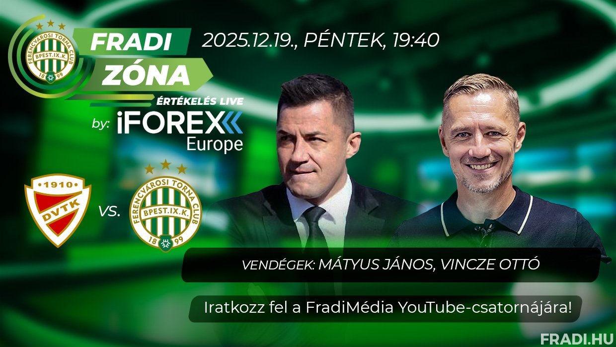 36-szoros magyar bajnok férfi labdarúgócsapatunk december 19-én, vasárnap 20.00-tól a Diósgyőr vendége lesz a Fizz Liga 18. fordulójában. A Fradi Zóna Értékelés Live by iFOREX Europe adása már 19.40-kor elkezdődik a felvezetéssel. Ezt követően a szünetben és a lefújás után is értékelik vendégeink a látottakat.