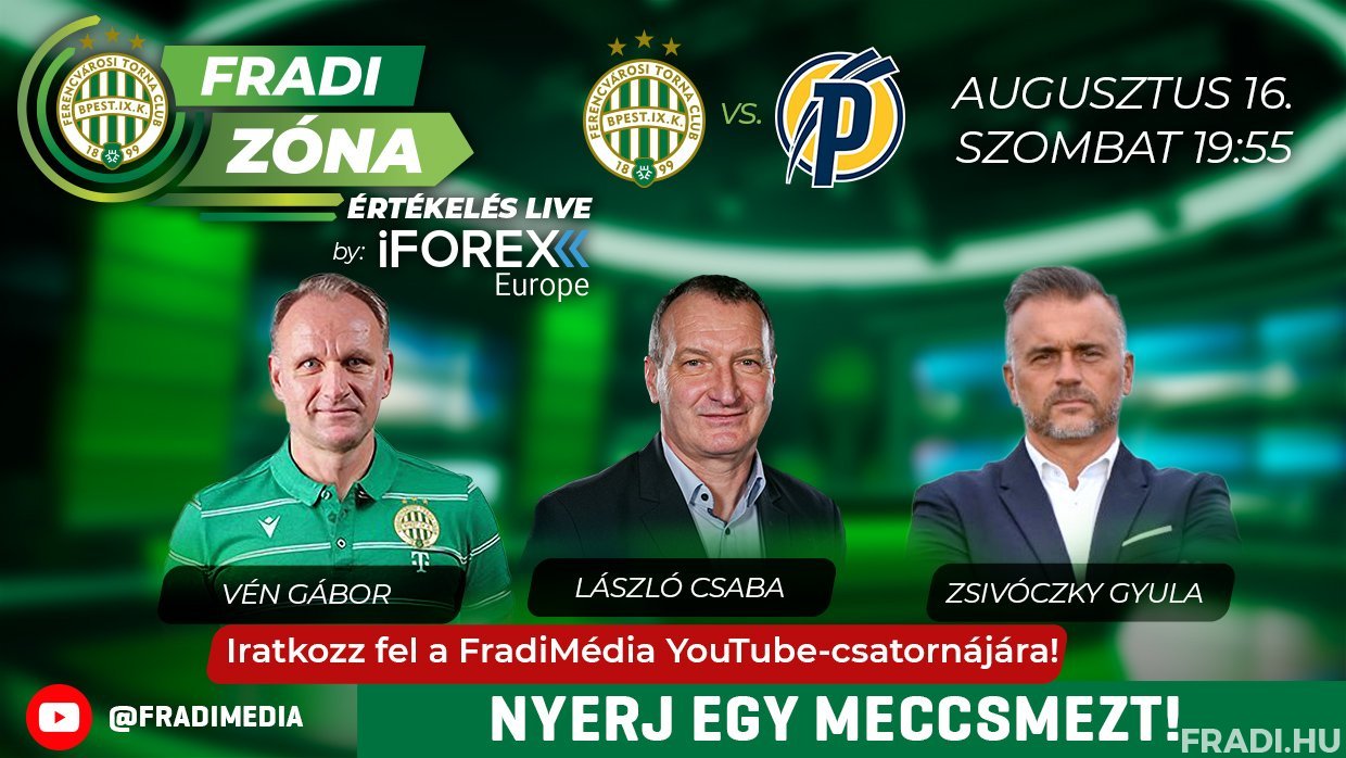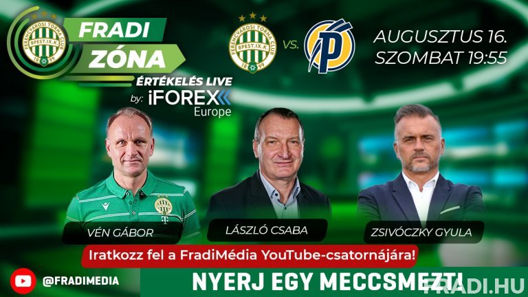 A Fradi Zóna Értékelés Live by iFOREX Europe adását a FradiMédia hivatalos YouTube-csatornáján kísérhetik figyelemmel.