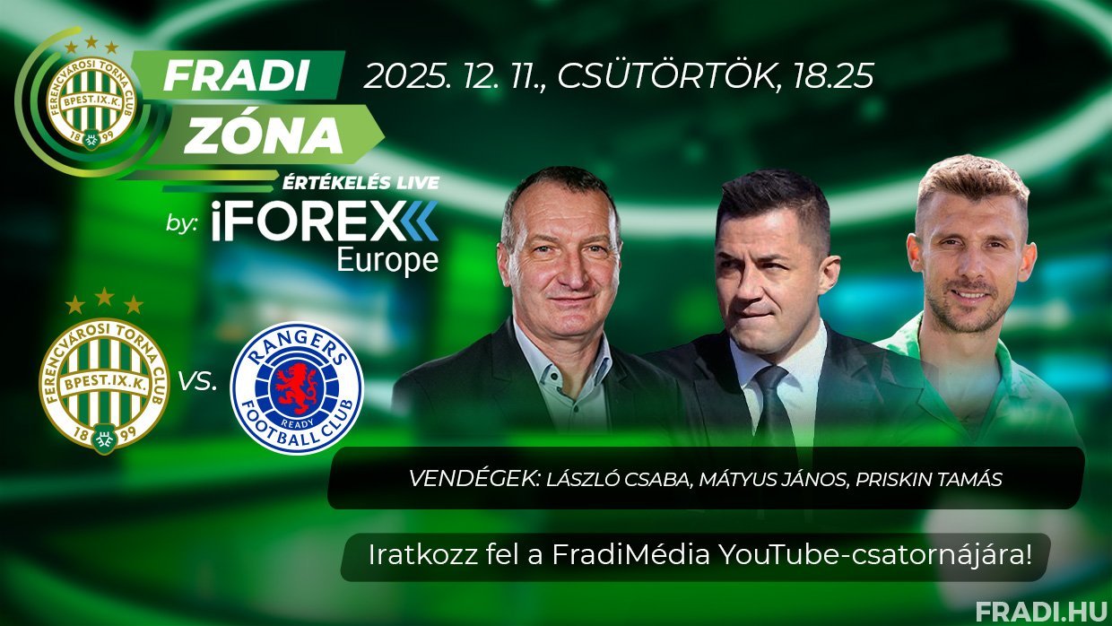 36-szoros magyar bajnok férfi labdarúgócsapatunk december 11-én, csütörtökön, 18.45-től a skót Rangerst fogadja az UEFA Európa Ligában. A Fradi Zóna Értékelés Live by iFOREX Europe adása már 18.25-kor elkezdődik a felvezetéssel. Ezt követően a szünetben és a lefújás után is értékelik vendégeink a látottakat. Vendégünk lesz az FTC korábbi bajnok játékosa, Priskin Tamás, korábbi edzőnk, László Csaba, valamint a Fradiban 93 meccsen pályára lépett Mátyus János.