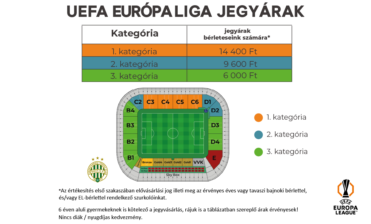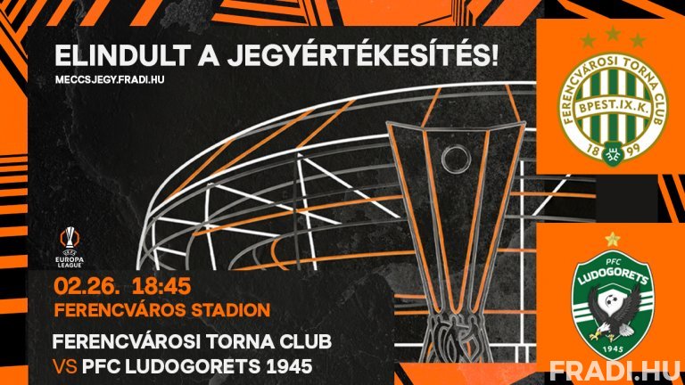 Bérletes szurkolóink a jegyvásárlás első szakaszában 3 kategóriában (1. kategória: C3-C4-C5-C6 szektorok, 2. kategória: C2-D1-D2 szektorok, 3. kategória: B1-B2-B3-B4-D3-D4 szektorok) vehetik meg a Ludogorec elleni hazai mérkőzésre szóló belépőjüket. A bajnoki szezonbérlettel rendelkezők (ideértve a tavaszi bajnoki bérlettel rendelkező drukkereink közül azokat, akik 2026. január 30., 13.00 óráig vásárolták meg a tavaszi idényre szóló bérletüket), az 1. kategóriás jegyeket 14 400 forintért, a 2. kategóriás belépőket 9 600 forintért, míg a 3. kategóriás meccsjegyeket 6 000 forintért vásárolhatják meg.