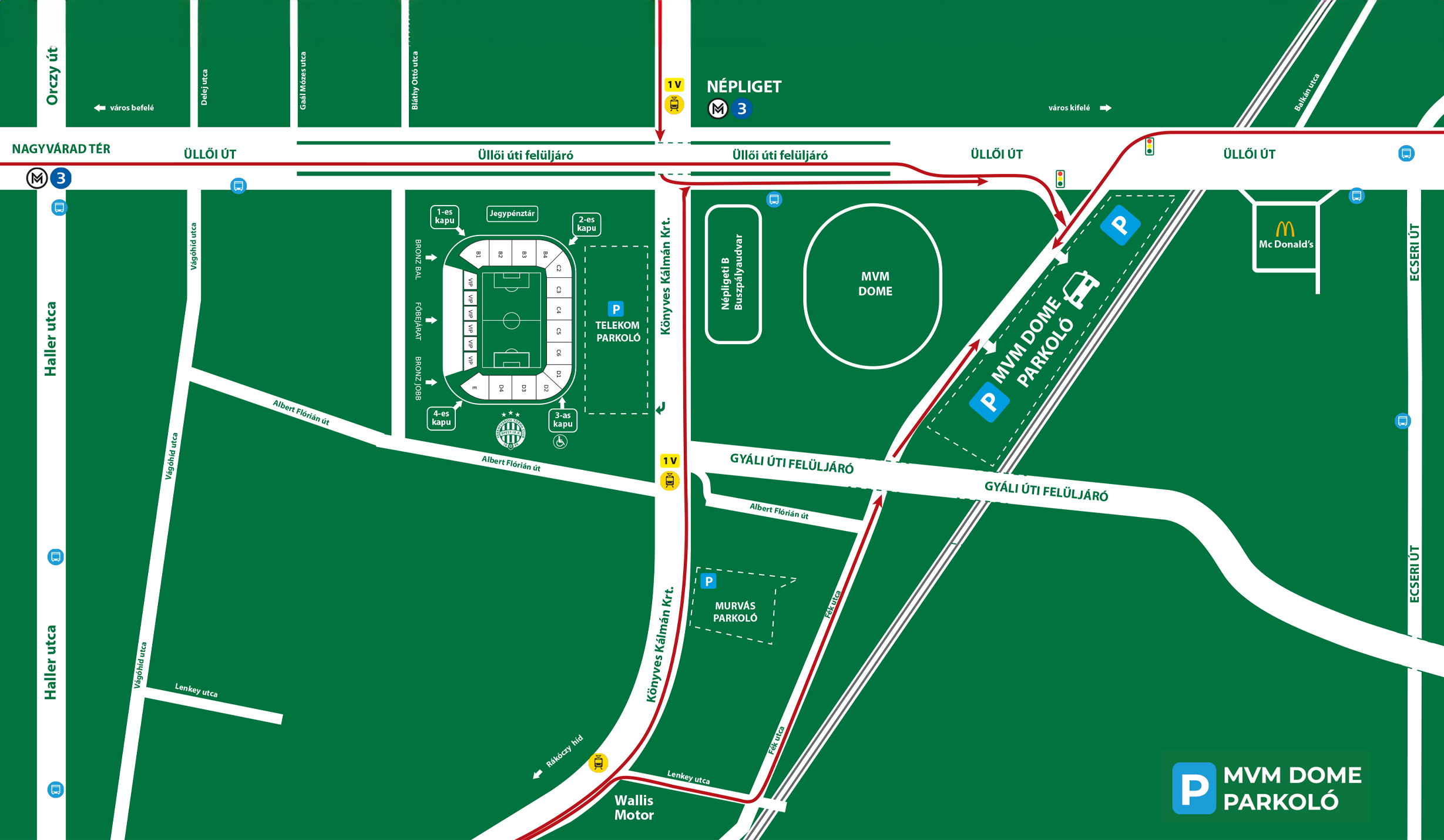 A parkolót a belvárosból érkezve az Üllői úti felüljárón végig hajtva, a lámpánál jobbra kanyarodva az út mellett találják meg. Azon drukkereink, akik a Rákóczi híd felől jönnek, két módon is eljuthatnak ide: előbb a Wallis Motornál jobbra, majd az út végén balra kanyarodva érhetik el az MVM Dome murvás parkolóját. Egy másik lehetőség a Rákóczi híd felől érkezőknek, hogy végig mennek a Könyves Kálmán körúton, majd az Üllői úthoz érve a felüljáró előtt jobbra kanyarodnak, a lámpánál pedig ismét egy jobb kanyart kell venniük, hogy eljussanak a parkolóig.