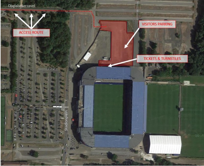 A szurkolói buszok és az autóval közvetlenül a stadionhoz érkező szurkolók is itt parkolhatnak majd, de akik a városból jönnének a stadionba, azoknak 18.00-tól ingyenes ingajárattal lesz lehetőségük utazni a genki vasútállomástól a stadionba. A vasútállomás mellett található Markstraaton lesz a vendégszurkolói gyülekezőhely.
