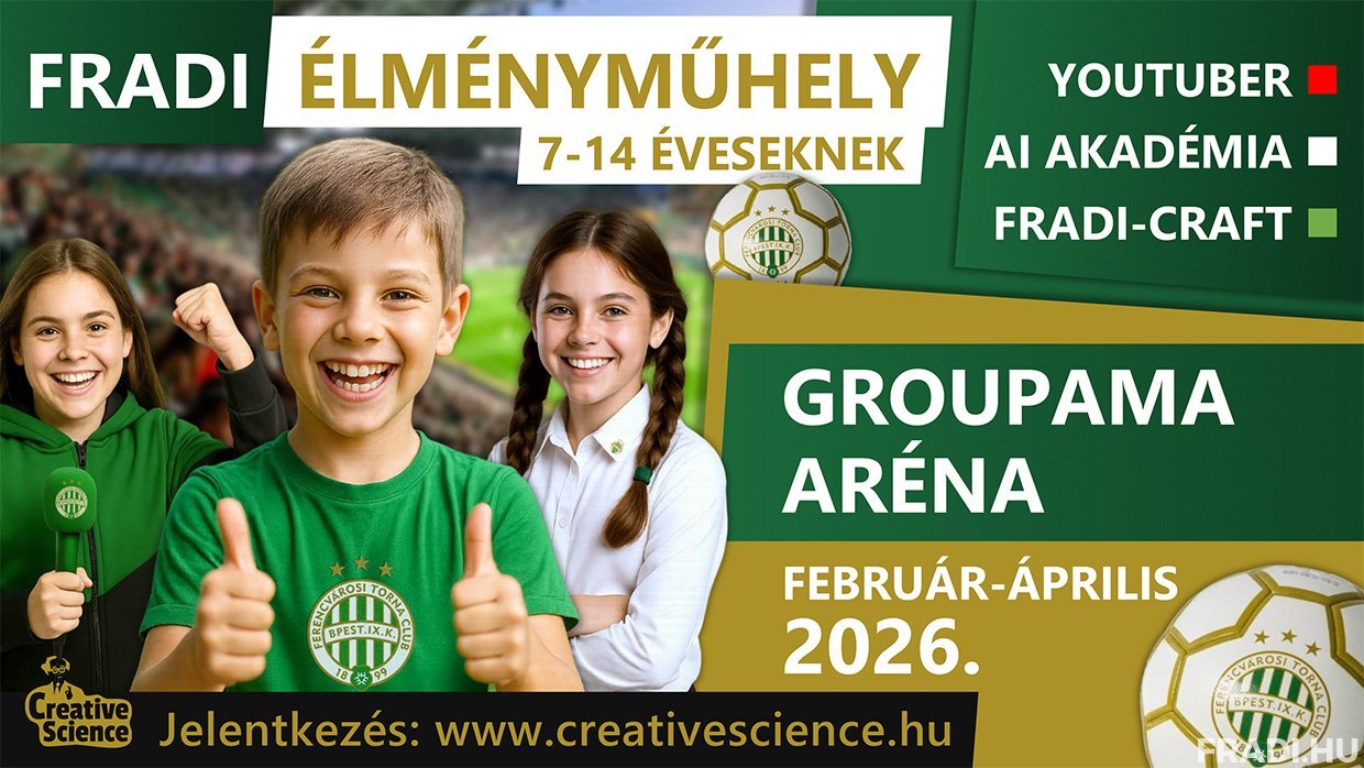 A Creative Science és a Ferencváros három, gyermekeknek szóló foglalkozást indít februárban a Groupama Arénában: a Fradi YouTuber workshopot, a FradiCraft-ot és a Fradi AI Akadémiát. A három foglalkozás programja összeköti a Fradi közösségi szellemét, hagyományait, a Creative Science oktatási tapasztalatát és a digitális világ kreatív eszközeit.