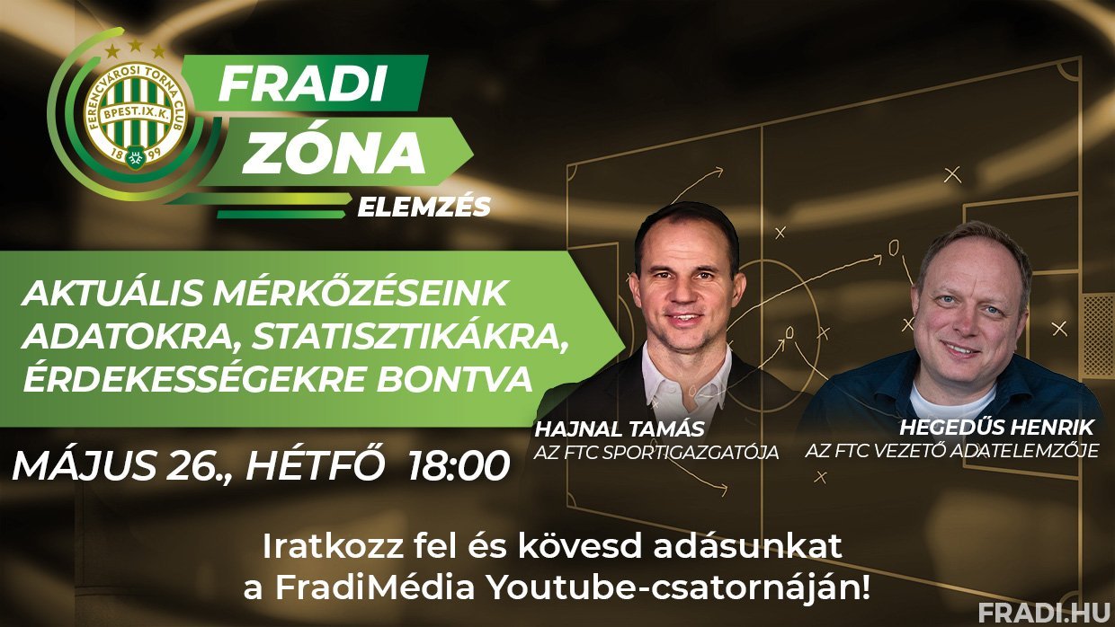 A Győr elleni idegenbeli, 36. bajnoki címet jelentő 2-1-es győzelem után május 26-án, hétfőn, 18.00-tól kerül sor a mérkőzés és a mögöttünk álló szezon kielemzésére a Fradi Zóna Elemzés következő adásában, amely ezúttal egy különleges vendéggel is kiegészül, ugyanis Hegedűs Henrik mellett férfi labdarúgócsapatunk sportigazgatója, klubunk korábbi ikonja, Hajnal Tamás is beszél a győzelemről és az újabb bajnoki címről, a mérkőzés statisztikáiról, a játék egyes aspektusairól, valamint játékosaink teljesítményéről. Az értékelő műsorhoz hasonlóan ezt az adást is az FTC hivatalos YouTube-csatornáján tudja megtekinteni. A Fradi Zóna Elemzés eddigi részeit IDE kattintva nézheti meg.