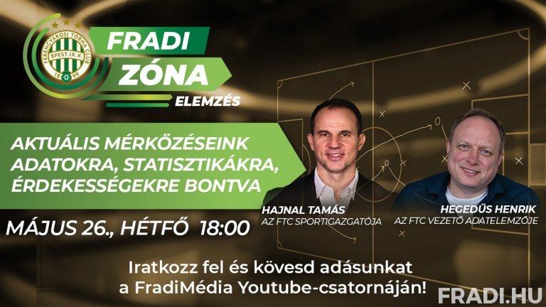 A nagysikerű meccsnapi értékelő műsor után április 7-én vadonatúj, exkluzív műsorral bővült vodcastunk: a Fradi Zóna Elemzésben az aktuális mérkőzésünket követő hétfőn Jáky Gergely műsorvezető az FTC vezető adatelemzőjével, Hegedűs Henrikkel beszélgetett, aki a legutóbbi találkozóból készített friss statisztikákkal, kimutatásokkal, érdekességekkel készült.