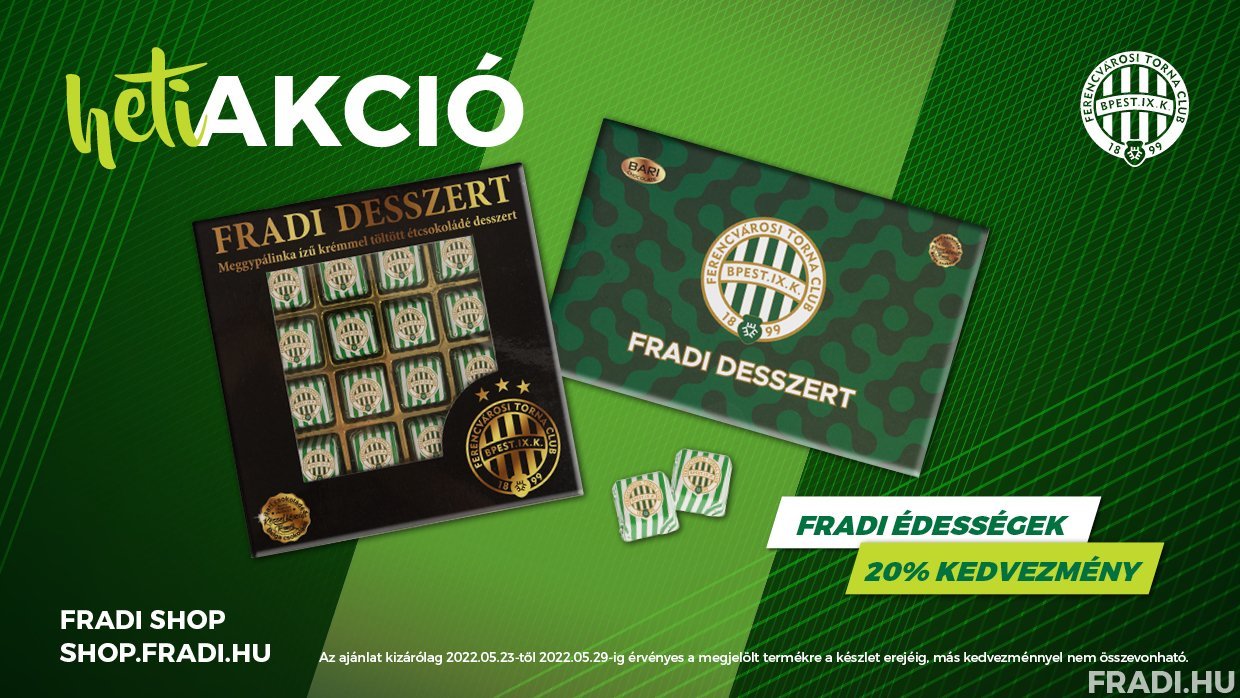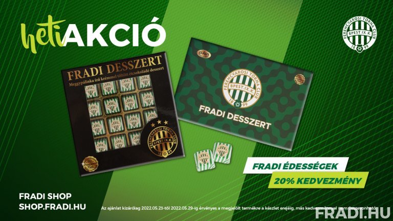 Édesszájú szurkolóink többféle finomság közül válogathatnak. Továbbra is kapható a Fradi nyalóka, a Fradi mogyorókrémes és barackpálinkás sportkocka, a Fradi táblás (70 százalékos) étcsokoládé, a Fradi tejkaramella és a Fradi csokitojások, desszertjeink közül pedig a Fradi banánkrémes vagy mogyorókrémes csokilabda díszdobozban, a Fradi banánkrémes focidesszert vagy a Fradi meggypálinkás desszert tökéletes választás akár alkalomra, ajándékba is.
