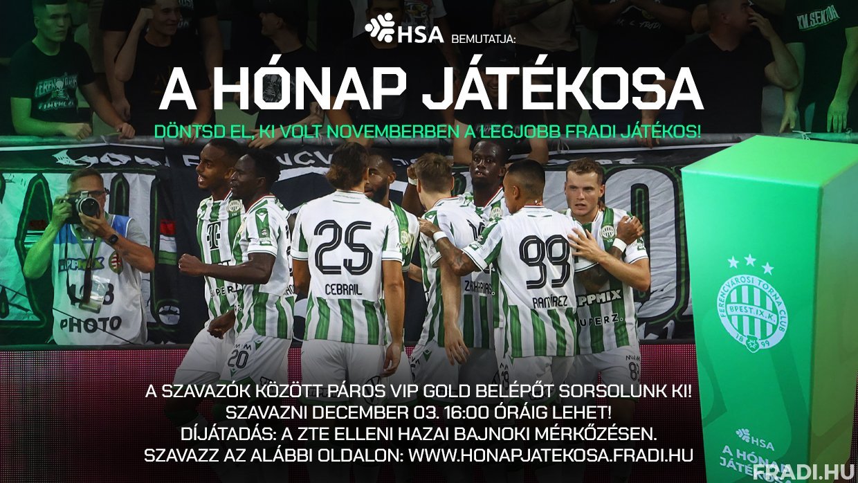 Ismét meghirdetjük szurkolói szavazásunkat, amelynek keretében szurkolóink dönthetik el, hogy az aktuális hónapban ki nyújtotta a legjobb teljesítményt férfi labdarúgócsapatunkból. November 29., péntek 10.00-tól egészen december 3., kedd 16.00-ig szavazhatnak a honapjatekosa.fradi.hu felületén.