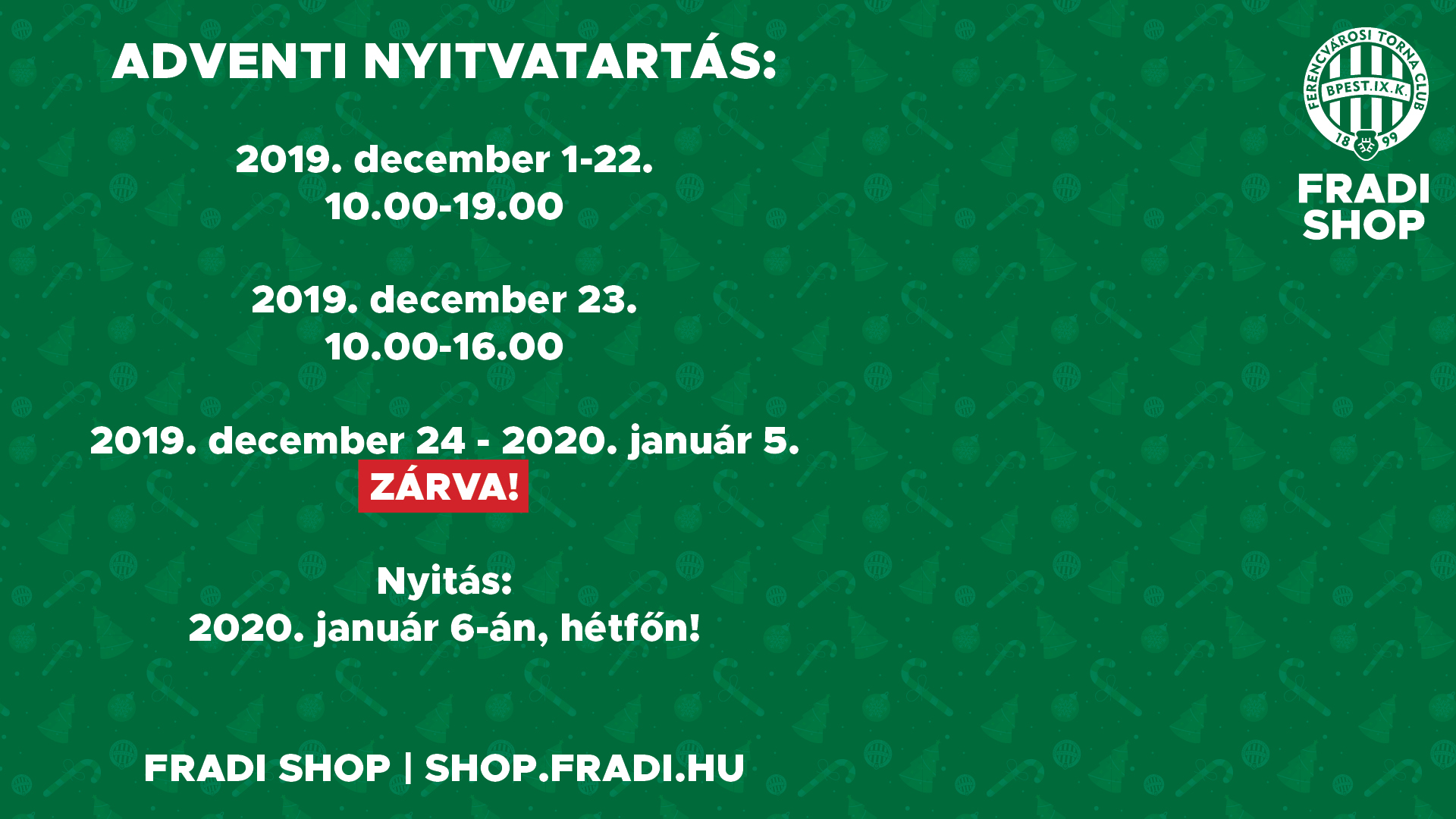 December 23-án, hétfőn 10-16 óra között tart majd nyitva a szurkolói bolt, amely december 24-től január 6-ig nem nyit ki. Az újév első nyitvatartási napja 2020. január 6-a, hétfő lesz!