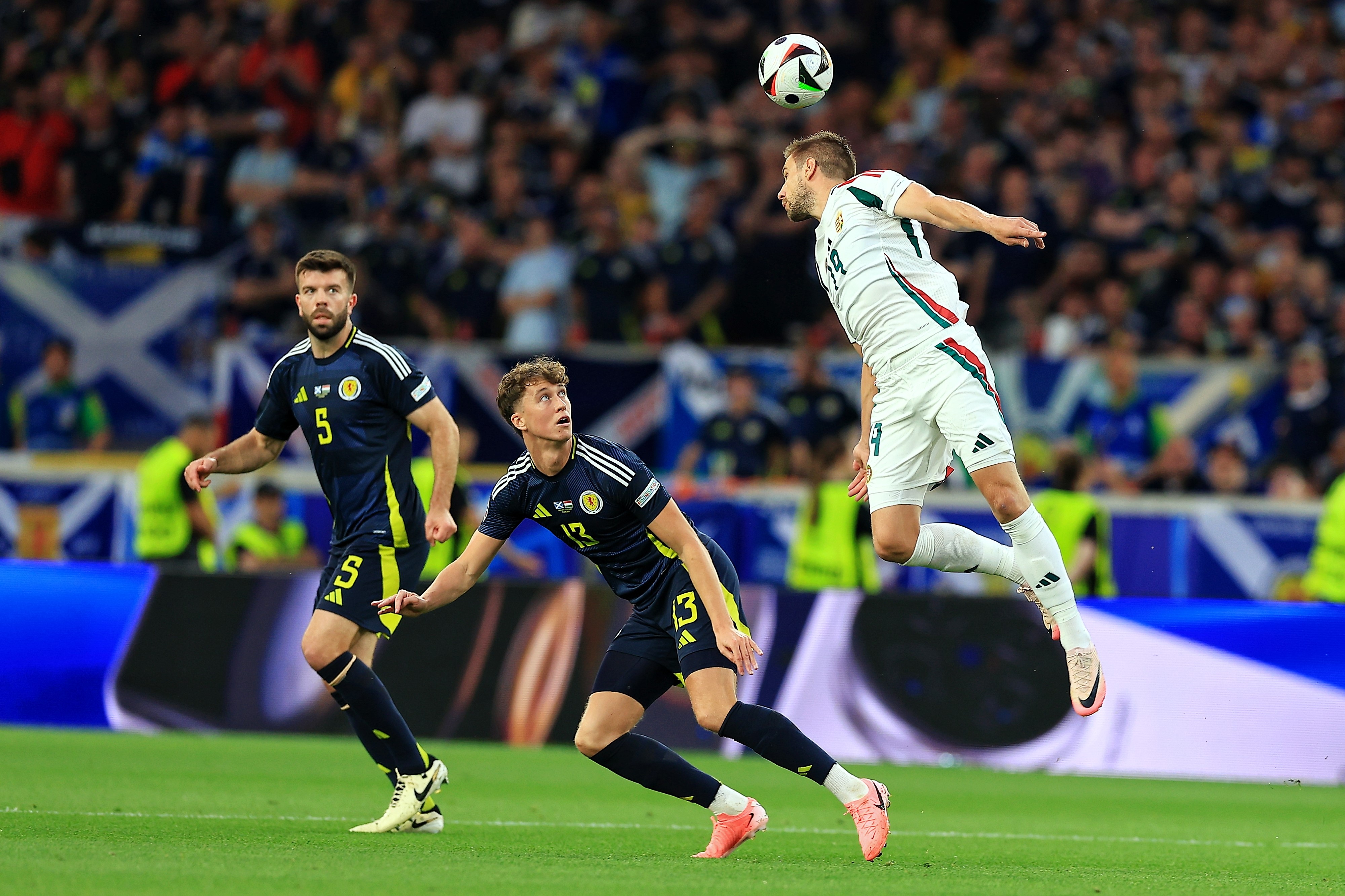 A mieink harmadik németországi Eb-meccsükön is fehér felszerelésben léptek pályára, míg a skótok sötétkékben. Mi kezdtük a mérkőzést. Az első percek helyzet nélkül teltek, mindkét csapatnak óriási téttel bírt a mérkőzés, ezért óvatosan indítottak, ismerkedtek az ellenféllel. A 8. percben Styles találta meg a jobboldalon felfutó Bolla Bendegúzt, aki előtt ott futott Varga Barnabás, a nyáron az osztrák Rapidba igazoló szárnyvédő passz helyett inkább lőtt a tizenhatoson kívülről, Gunn kapusról ki- és felpattant a labda, amelyet aztán hazafejelt neki egy védő. A 18. percben Styles csúszott rá McGinnre, amiért sárga lapot kapott. Pár perccel később Orbán késett el, ismét McGinn szenvedte el, újabb sárga. Eltelt fél óra és addig csak Bolla lövését jegyezhettük fel a részünkről, igaz a skótok se nyomtak minket a kapunkhoz.