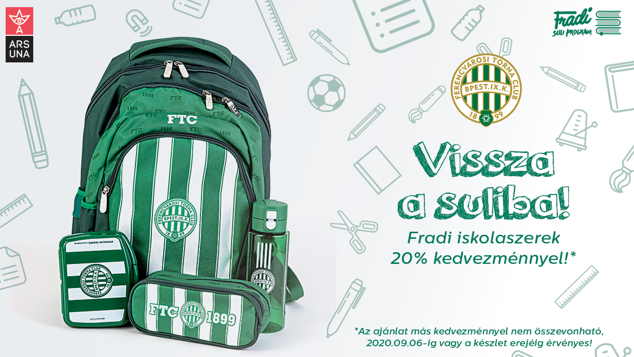 A hamarosan kezdődő tanévre az FTC is készül. Ha a Fradi Shopon keresztül szerzed be a következő tanév eszközeit, akkor komoly árengedményekkel számolhatsz, hiszen az ArsUna termékekből 20% kedvezményre leszel jogosult.