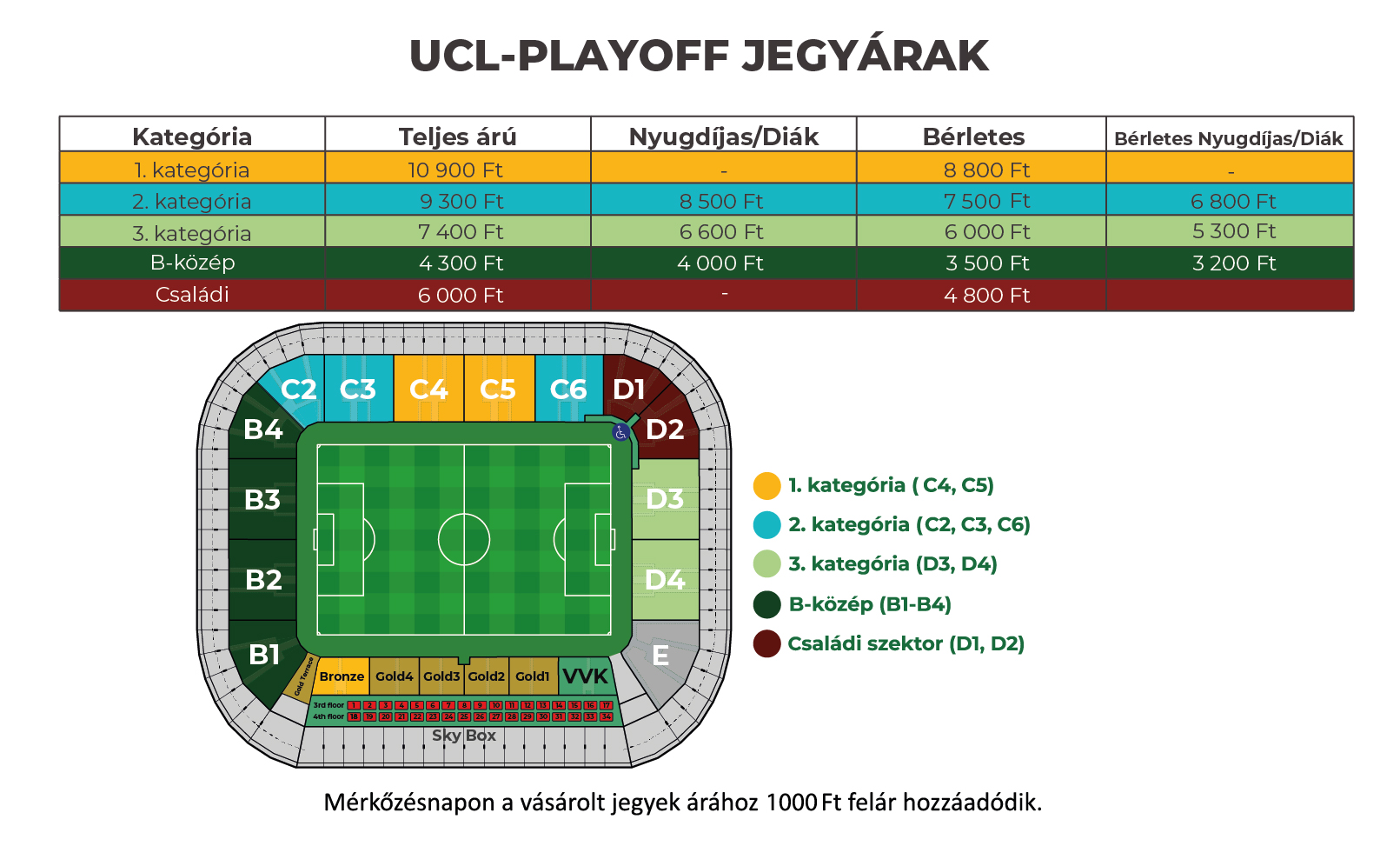 A B-középbe 4300 és 4000 forint a felnőtt és a kedvezményes belépők ára, míg a Családi szektorba (D1, D2) 6000 forintért válthatnak jegyet.